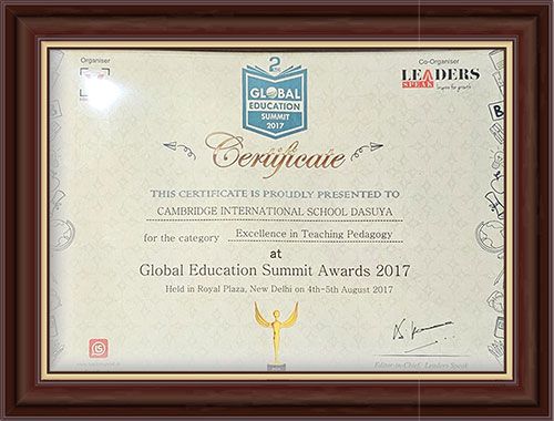The recognition acknowledged Cambridge International School, Dasuya in the category Excellence in Teaching Pedagogy Global Education Summit Awards, 2017 for learner-centric pedagogy and effective teaching methodologies that enhance student engagement and understanding.