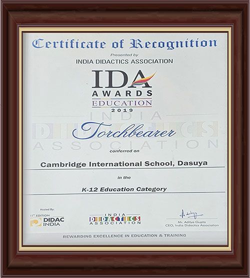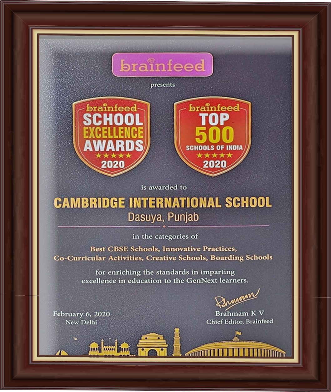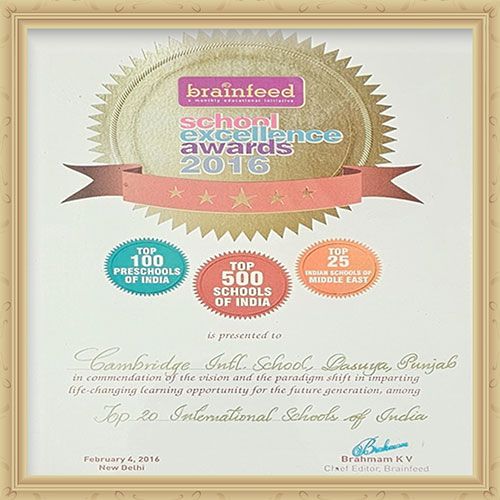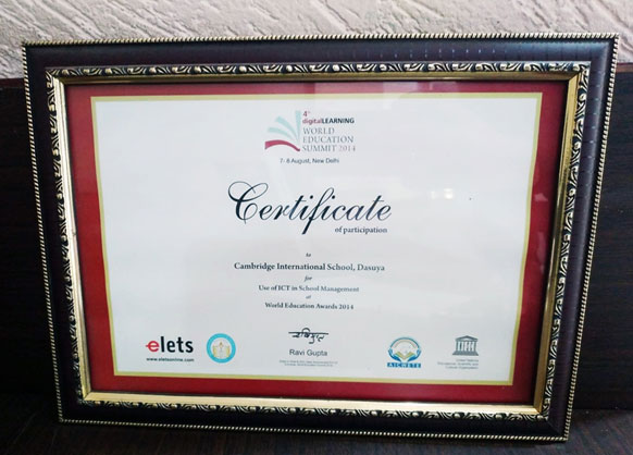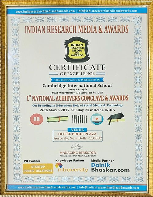 The Indian Research Media & Awards Certificate of Excellence recognised Cambridge International School, Dasuya as the Best International School in Punjab for the 1st National Achievers Conclave & Awards on Branding in Education: Role of Social & Technology, for excellence in innovation and effective use of technology and communication.