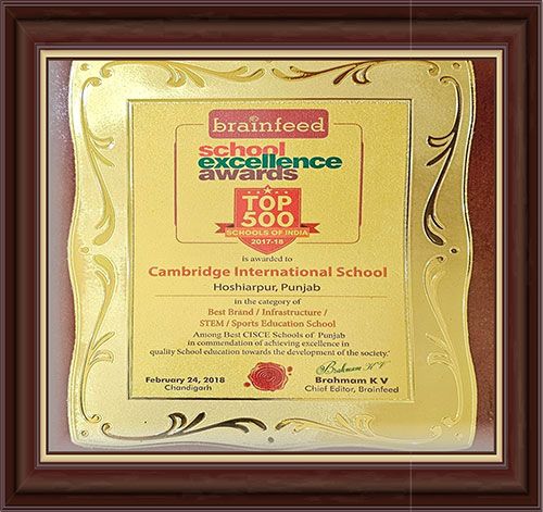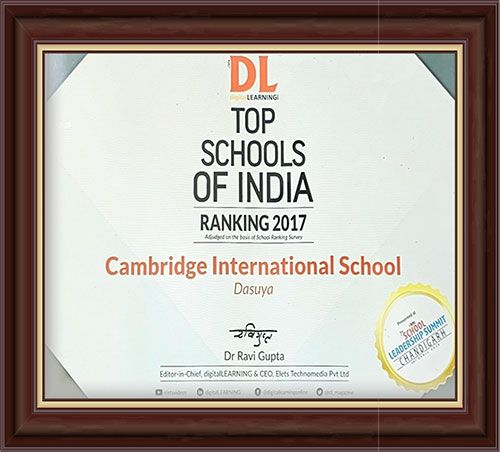 Cambridge International School, Dasuya was recognised in the Top 500 Schools of India for excellence in the category Best Brand/Infrastructure/STEM/Sports Education School among Best CISCE Schools of Punjab, reflecting its contribution to quality education and societal development.