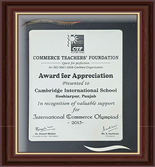 Cambridge International School, Dasuya was recognised for its valuable contribution and support in conducting the International Commerce Olympiad 2015, fostering an environment where students strive for excellence and brilliance in education.