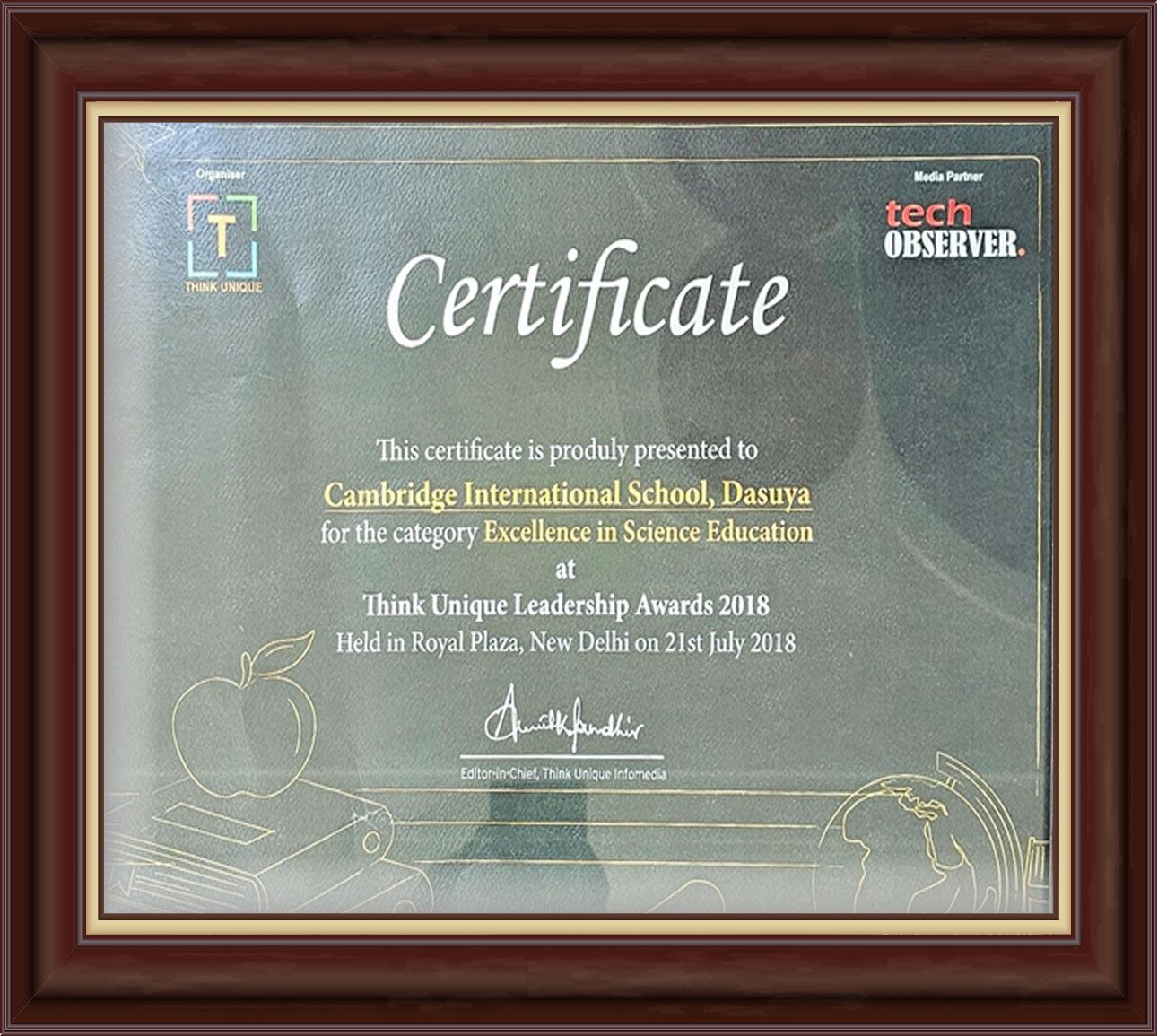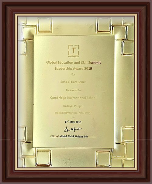 Think Unique Global Education & Skills Summit Leadership Award, 2019 acknowledged Cambridge International School, Dasuya with this award for sustained excellence in academics, leadership and holistic student development.