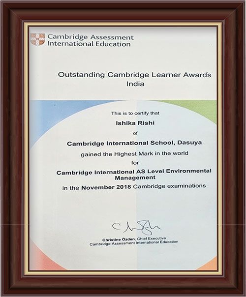 This award was presented to Ishika Rishi of Cambridge International School, Dasuya, who achieved the highest marks globally in Cambridge International AS Level Environmental Management in Nov 2018 by the Cambridge Assessment International Education Outstanding Cambridge Learner Awards India.