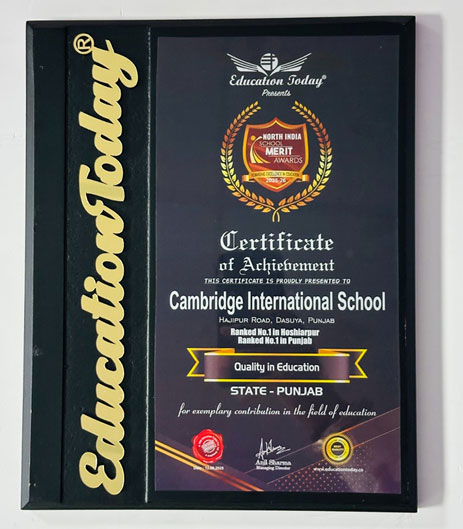 Cambridge International School, Dasuya was ranked No. 1 in Hoshiarpur and Punjab by Education Today for ‘Quality in Education’, reiterating our promise to provide a holistic learning journey for all our students.